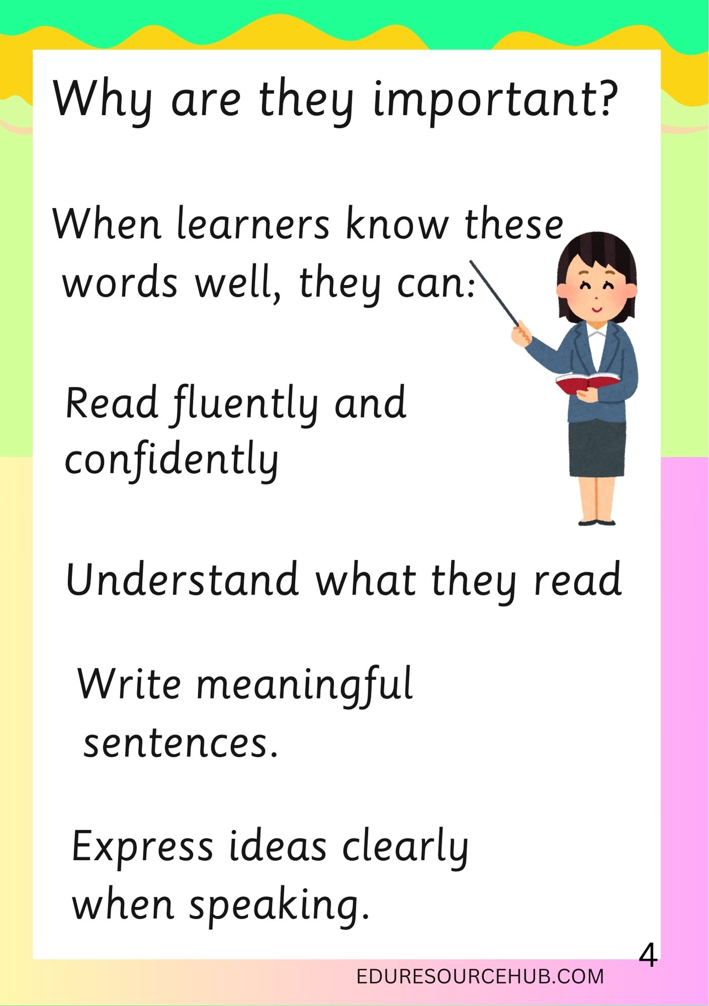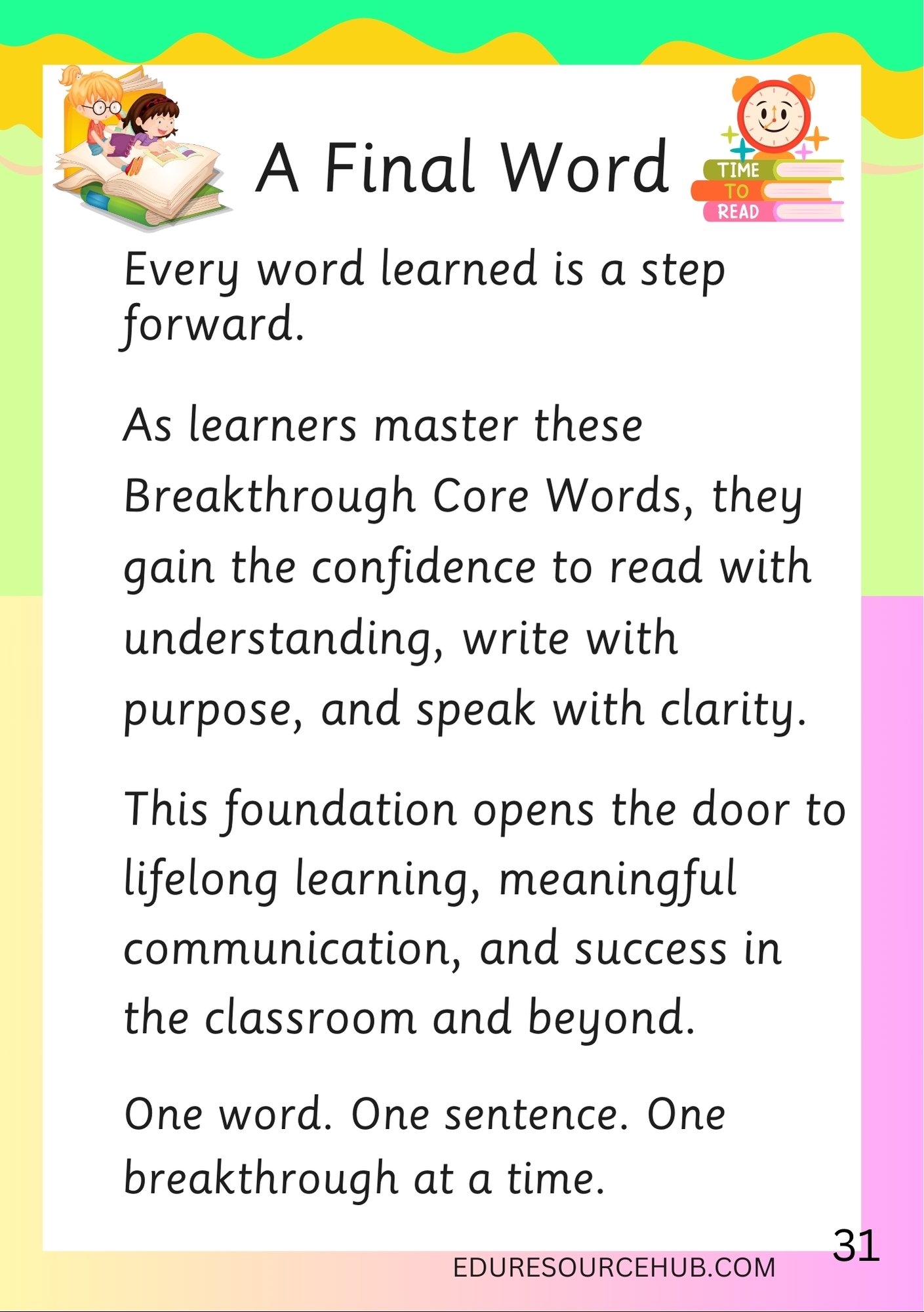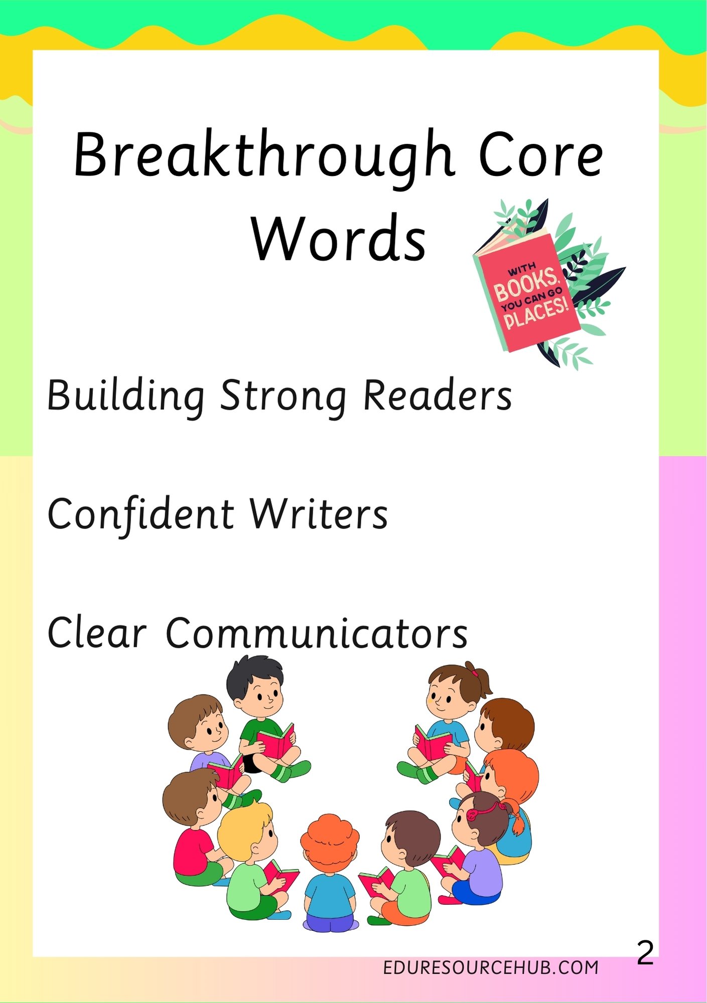 Breakthrough Core Words are high-frequency words that learners see, hear, and use every day. These words form the foundation of reading, speaking, and writing, making them essential for early language development. When learners master these core words, they are able to read more fluently and confidently, understand what they read, write meaningful sentences, and express ideas clearly when speaking.