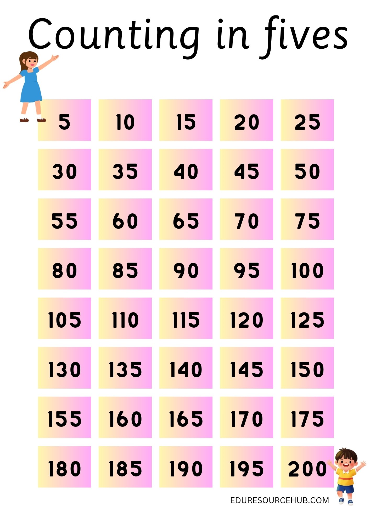 Bright, easy-to-read counting charts for counting 1–100 and counting in 5s. Perfect for classroom displays and daily counting practice.