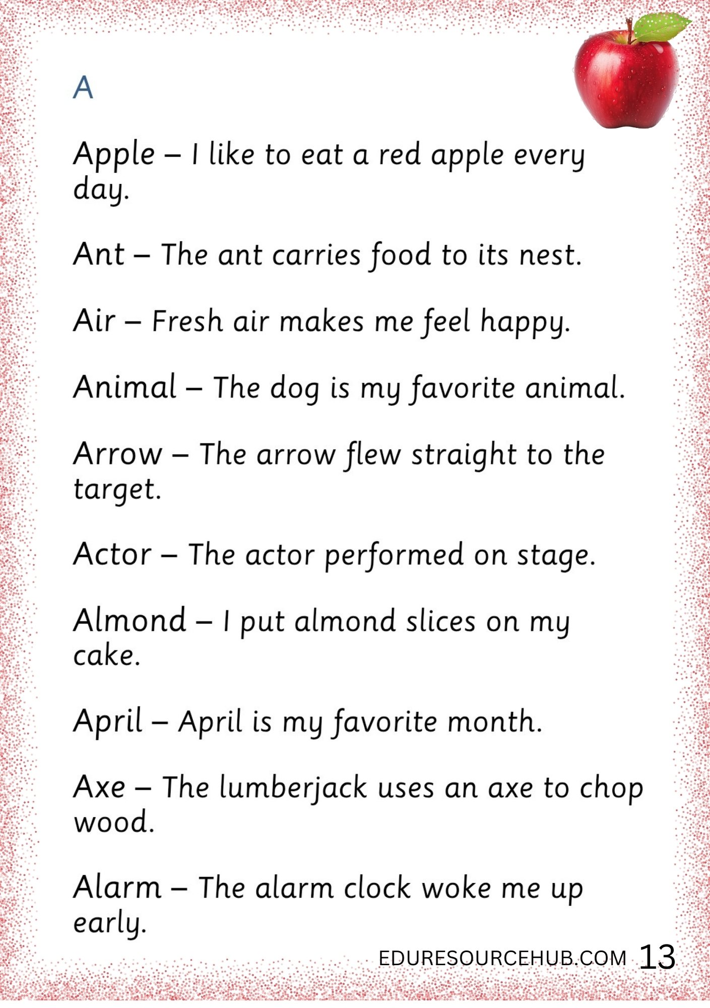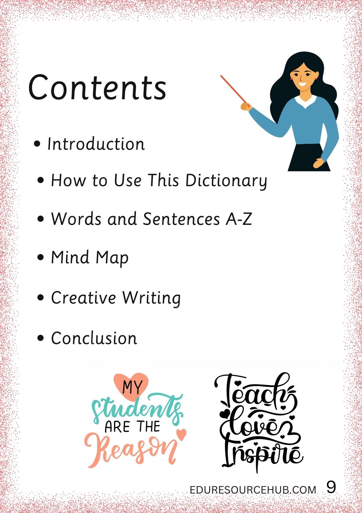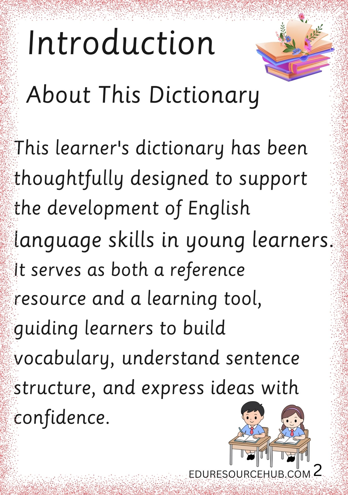 This learner-friendly English dictionary supports early language development through A–Z vocabulary, clear sentence examples, and guided creative writing activities. Ideal for classroom use, home practice, and independent learning.